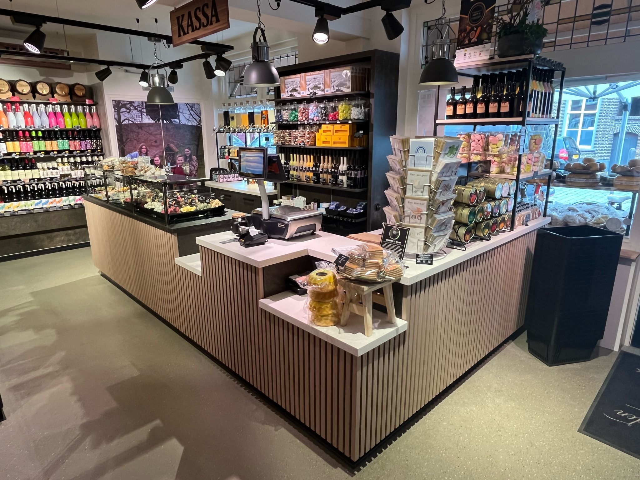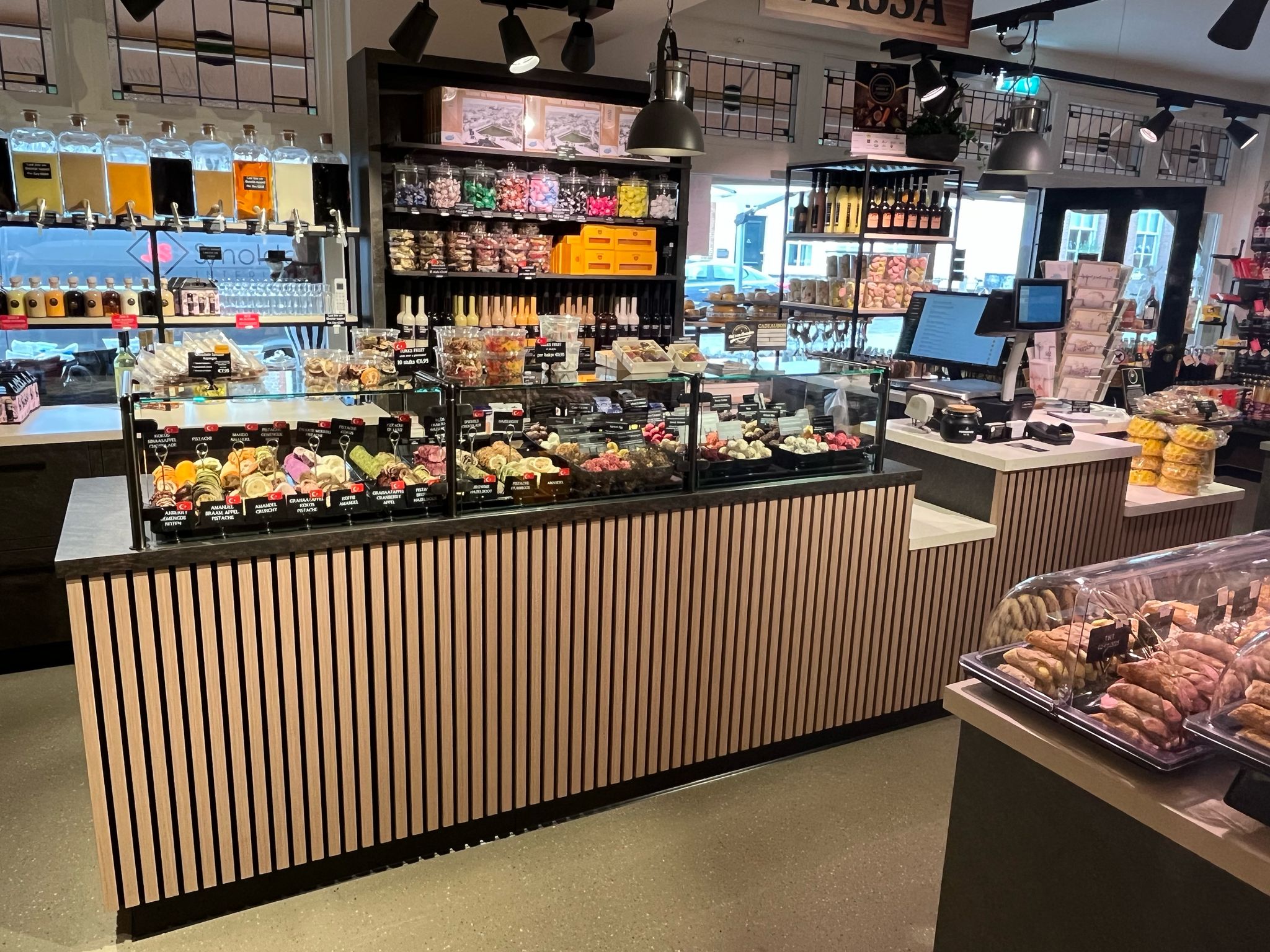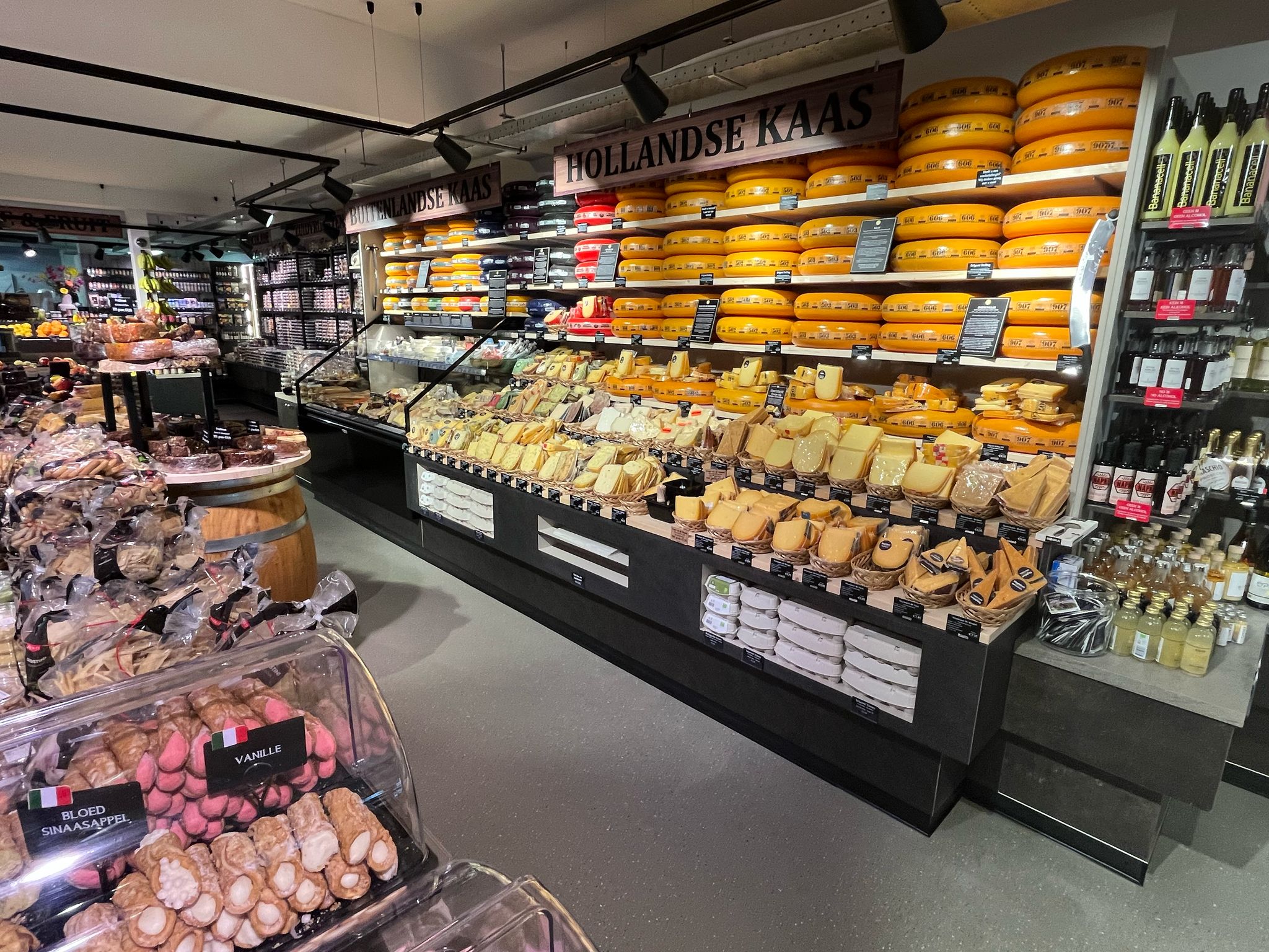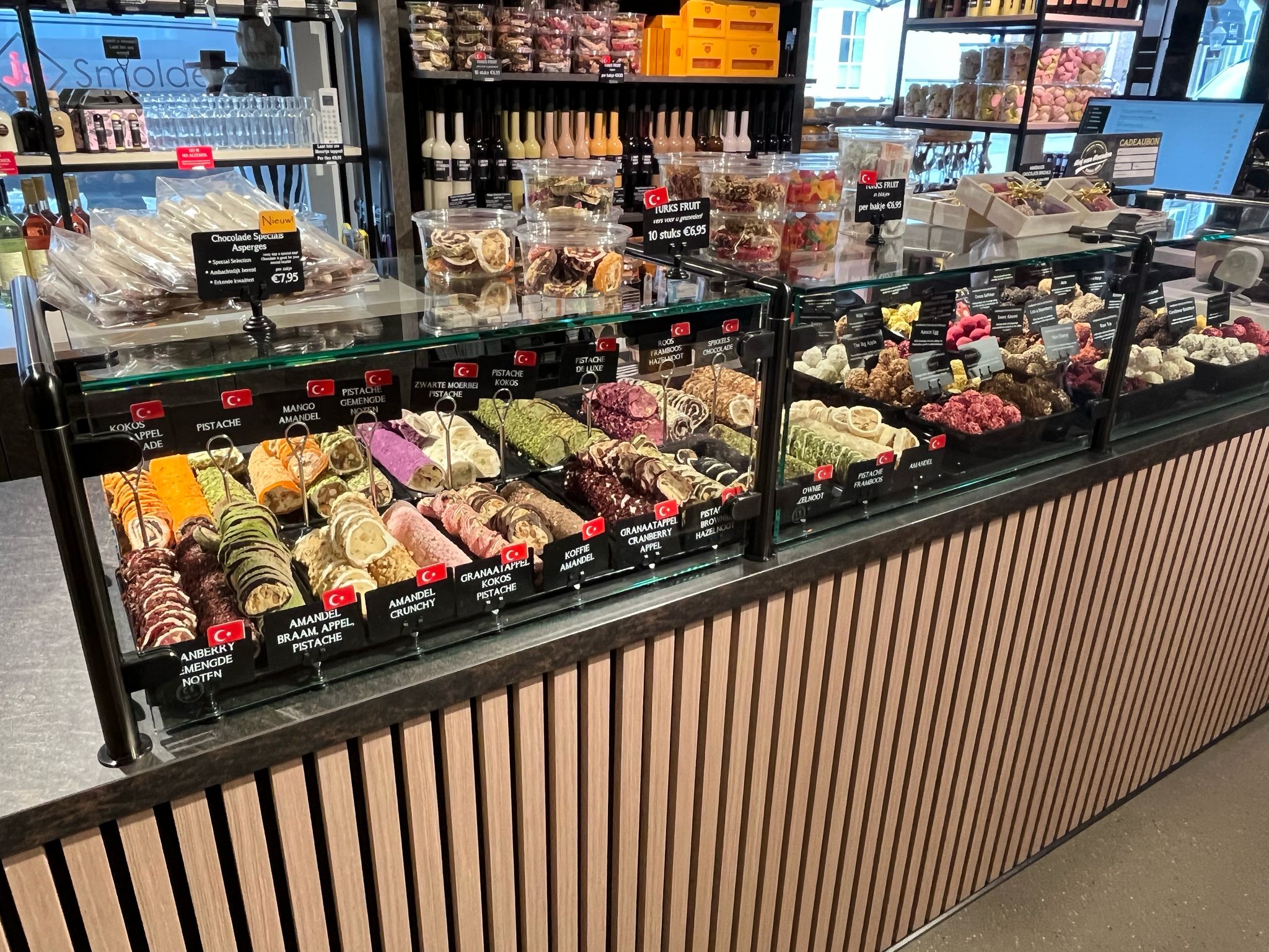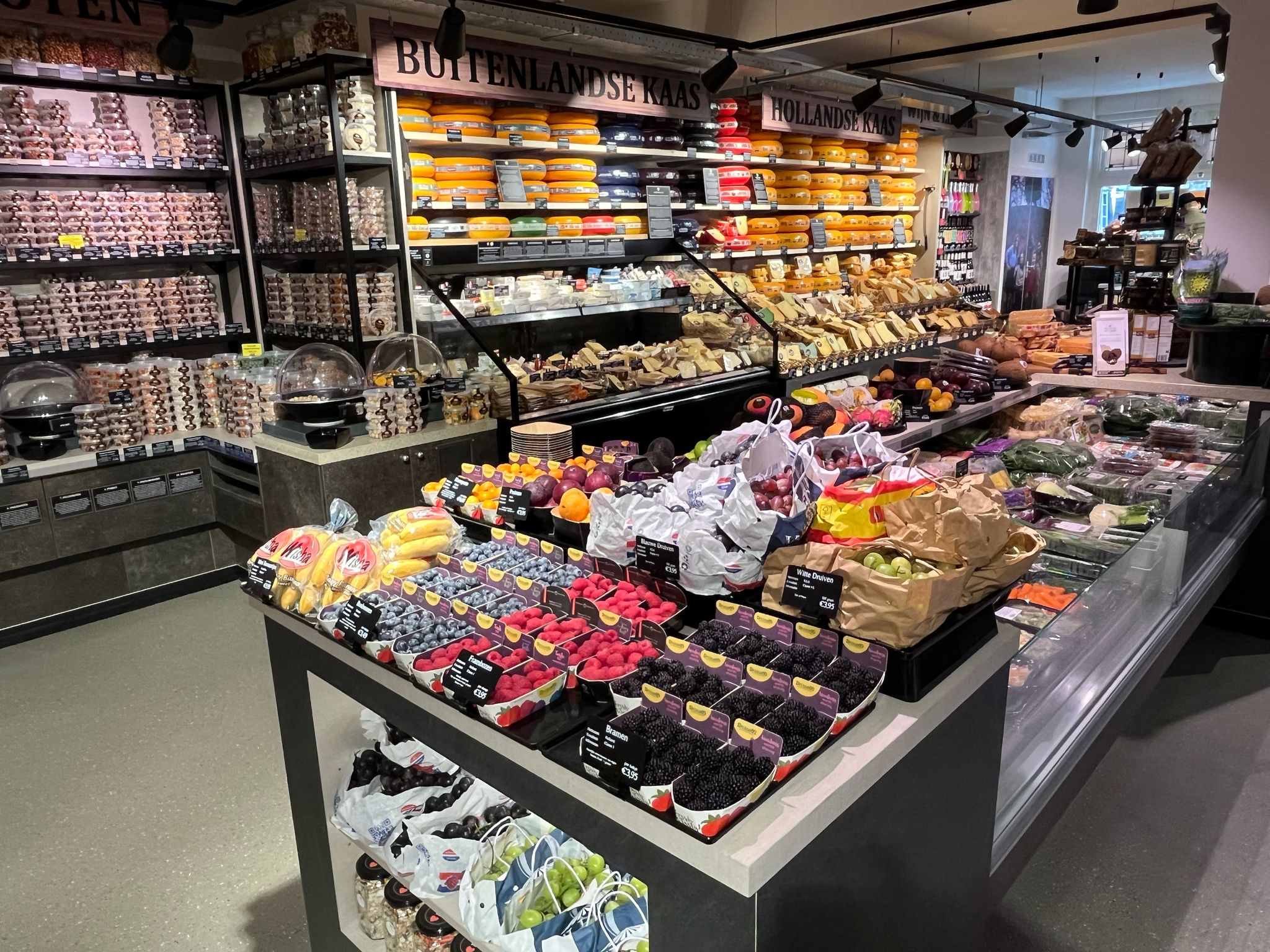 Verschillende interieuraanpassingen, een wand met koel- vrieswandkasten en een kaas wandkoelmeubel een in het oog springende afrekenbalie met een chocolade vitrine zijn hier geleverd.