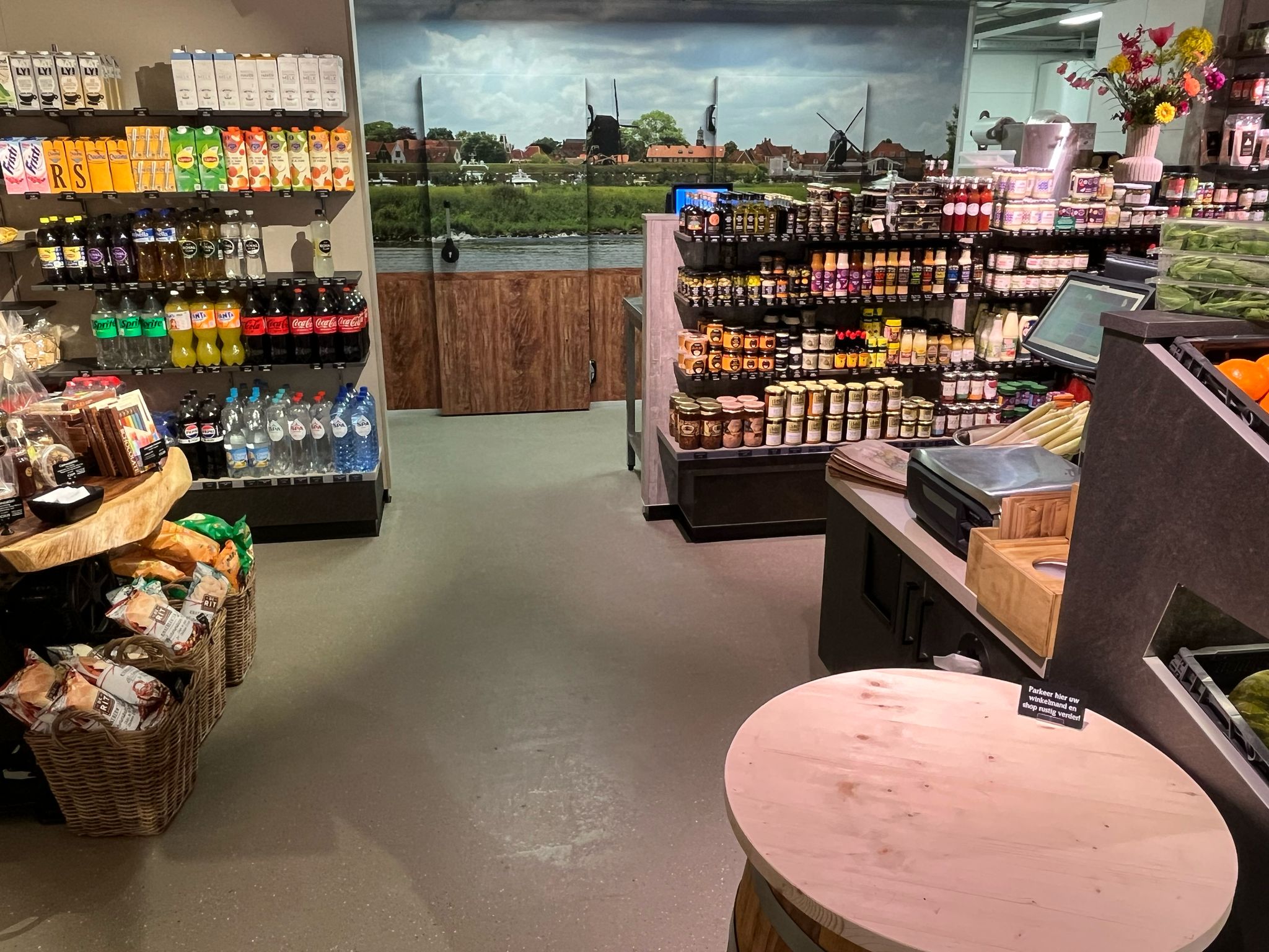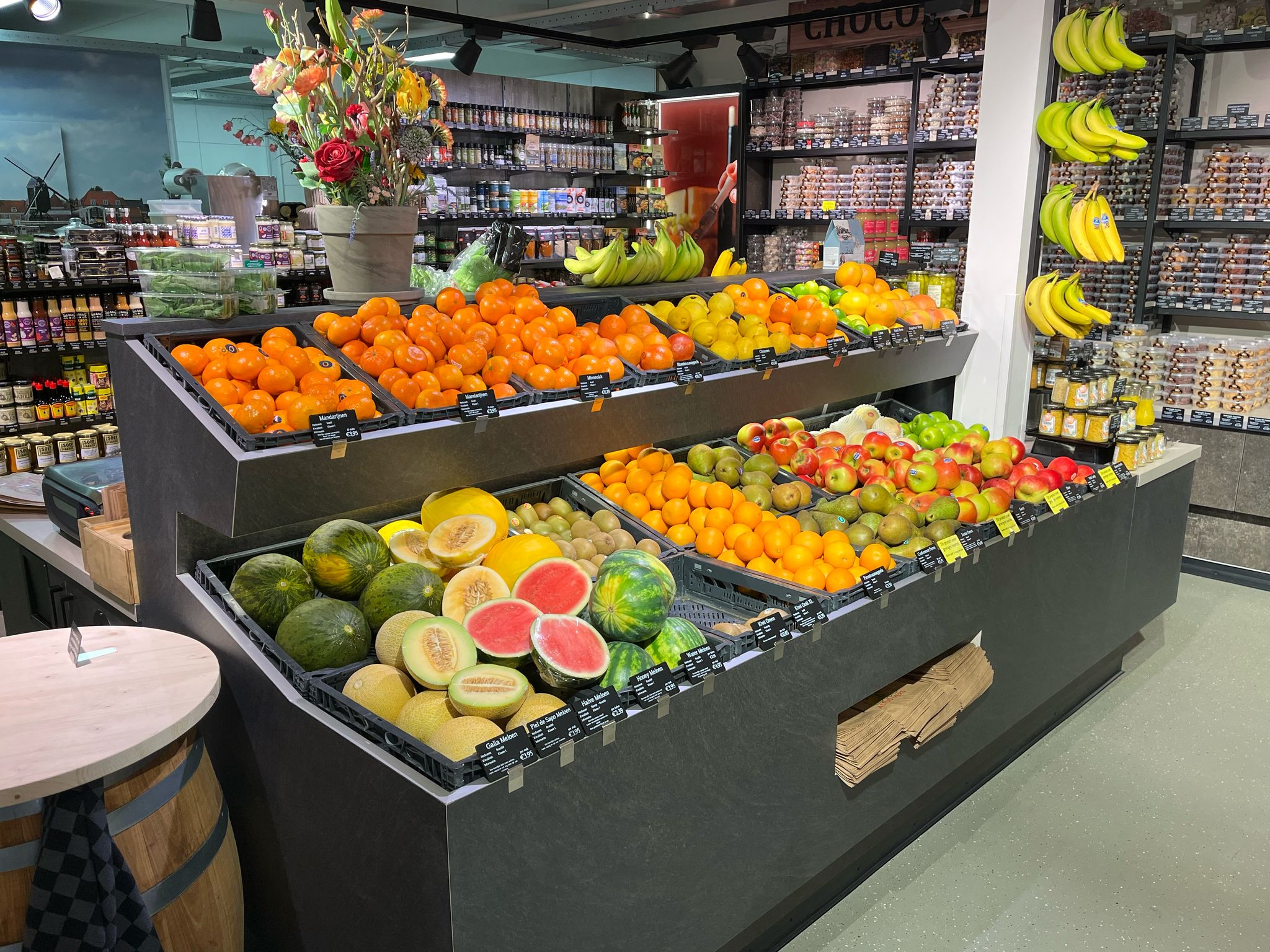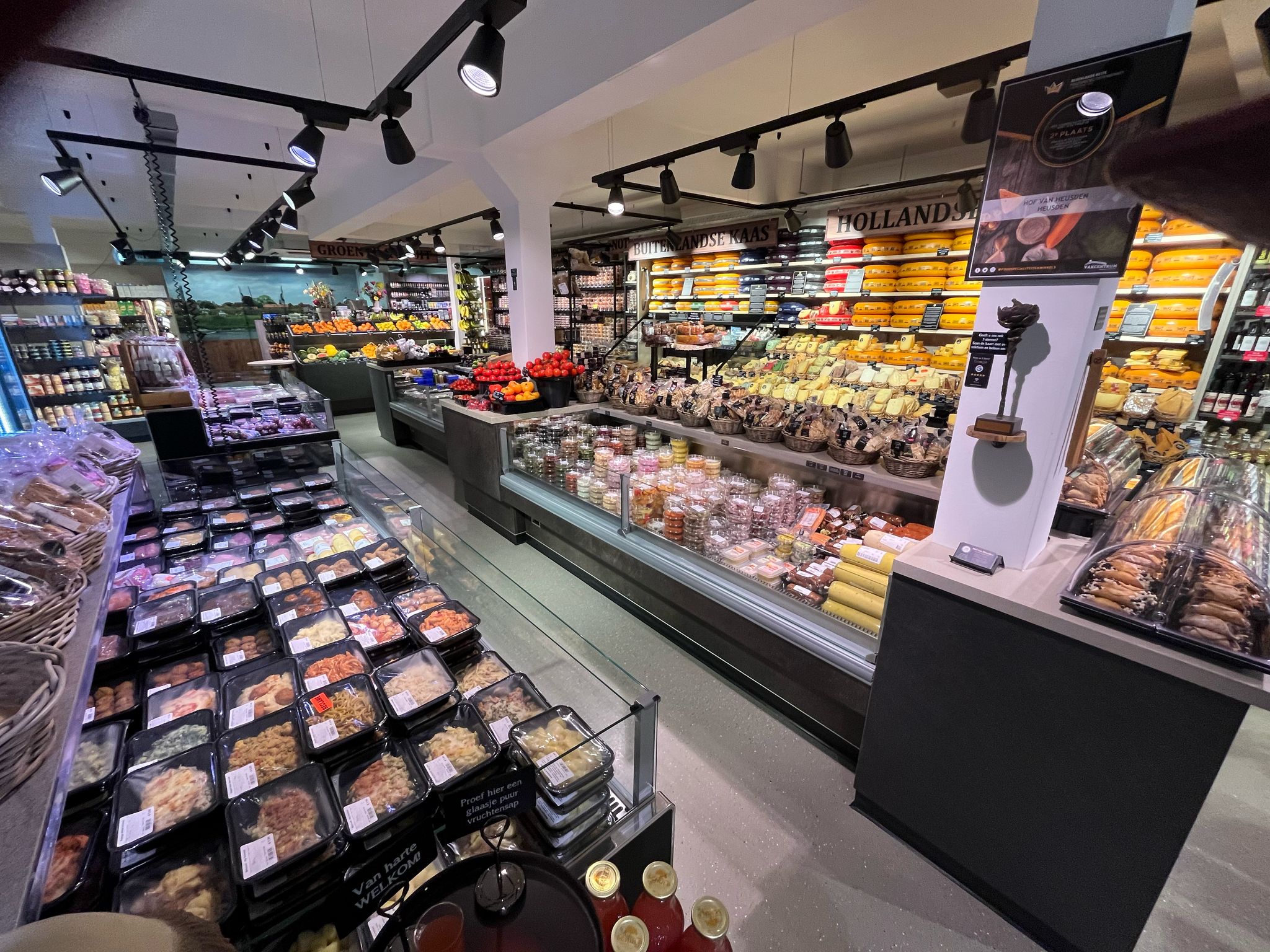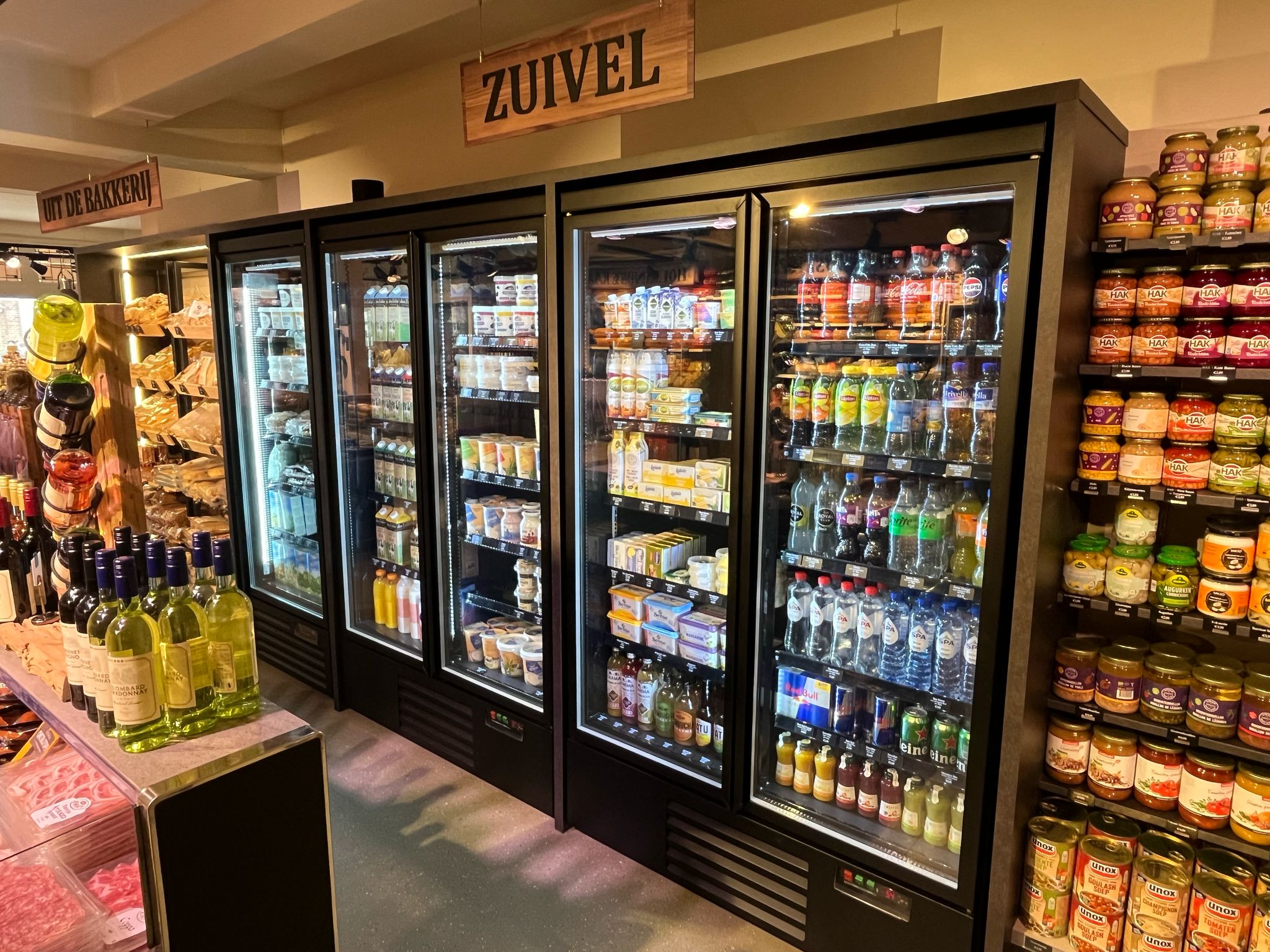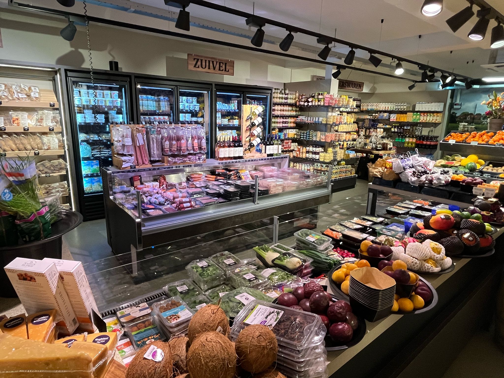 Verschillende interieuraanpassingen, een wand met koel- vrieswandkasten en een kaas wandkoelmeubel een in het oog springende afrekenbalie met een chocolade vitrine zijn hier geleverd.