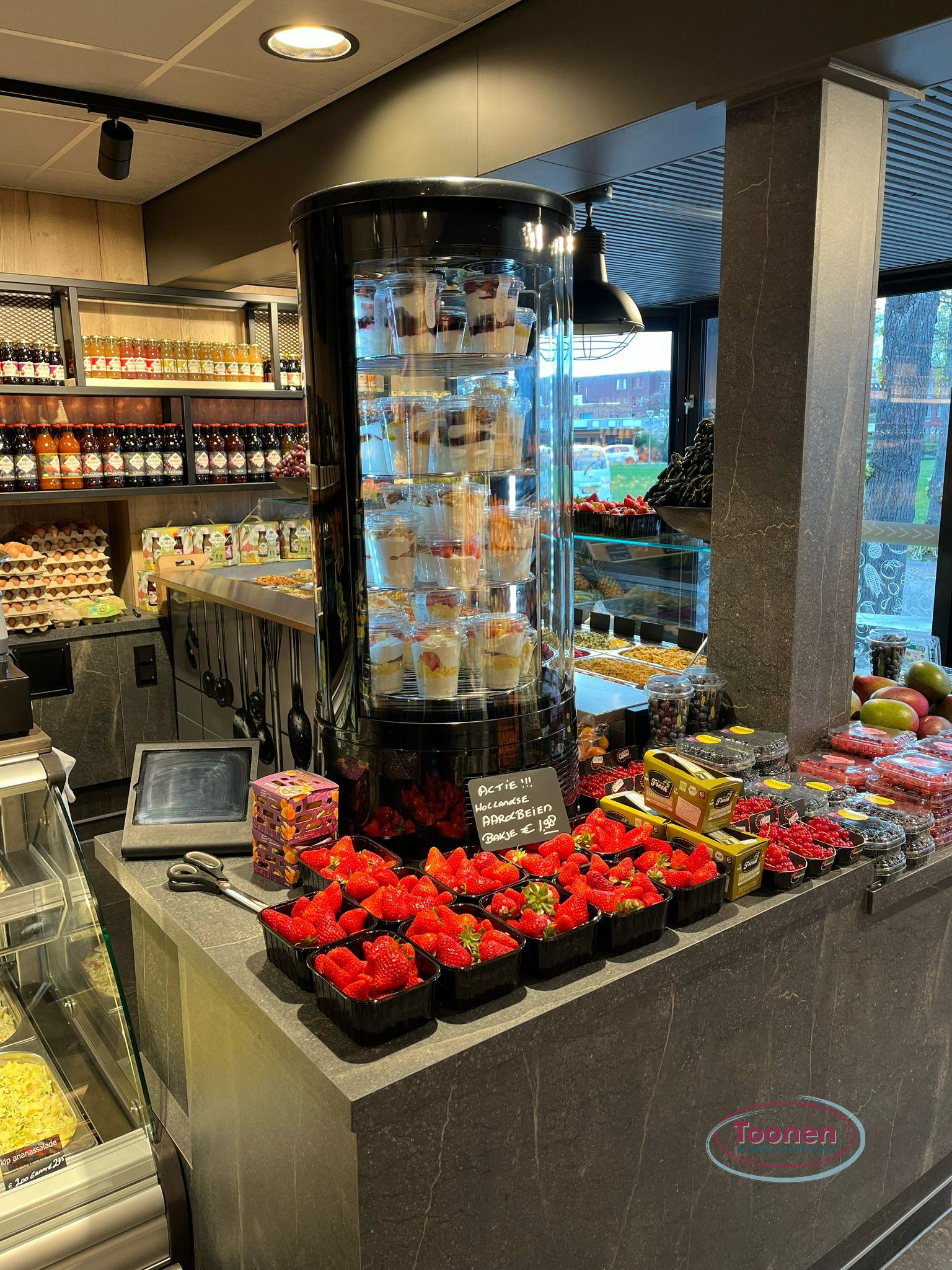 De draaiende koeltoren gevuld met toetjes trekt extra de aandacht van de consument.